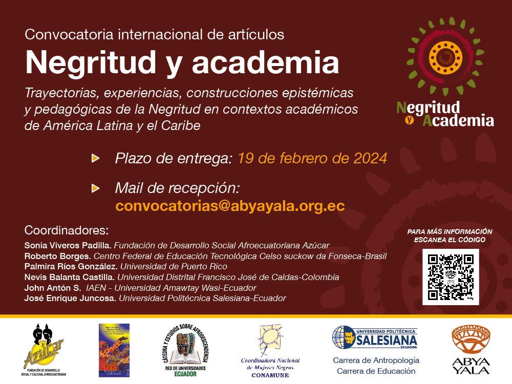 La Fundación de Desarrollo Social Afroecuatoriana AZÚCAR; la Red de Universidades para los Estudios y Cátedra sobre Afrodescendientes en América-Ecuador; las Carreras de Antropología y de Educación de la Universidad Politécnica Salesiana; y la Editorial Abya-Yala anuncian la convocatoria de artículos que integrarán el tomo monográfico “Cuando los otros hablan de nosotros”. Negritud y academia en América Latina, en el marco del Decenio Internacional para los afrodescendientes (2015-2024).
